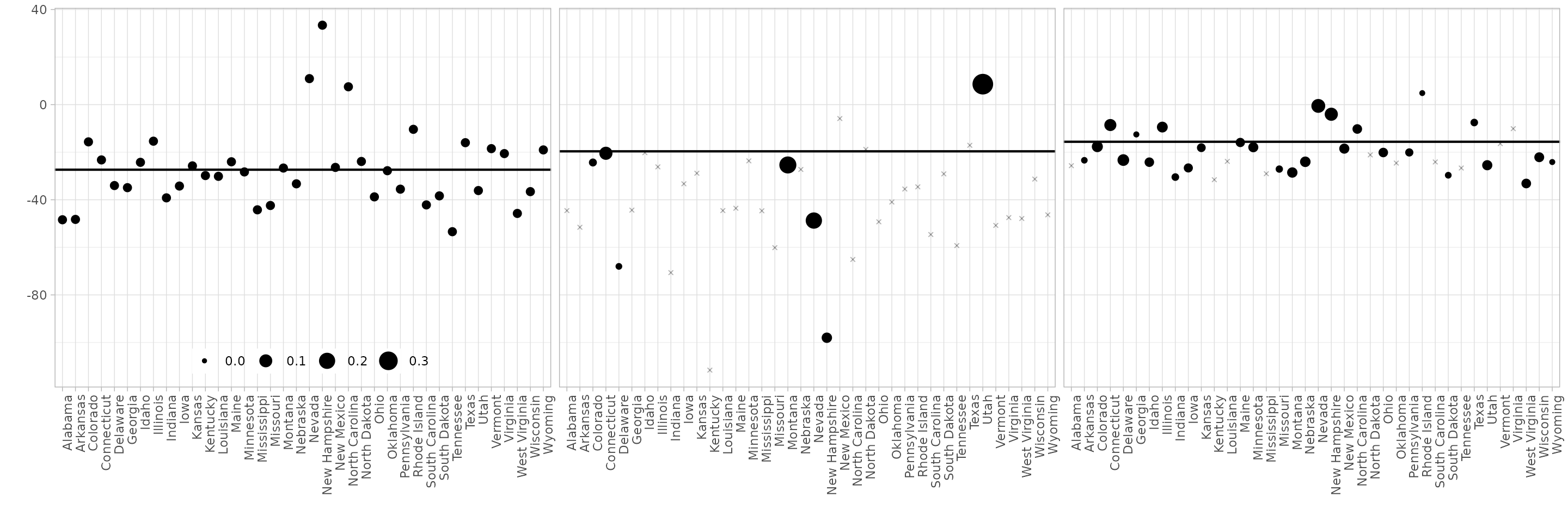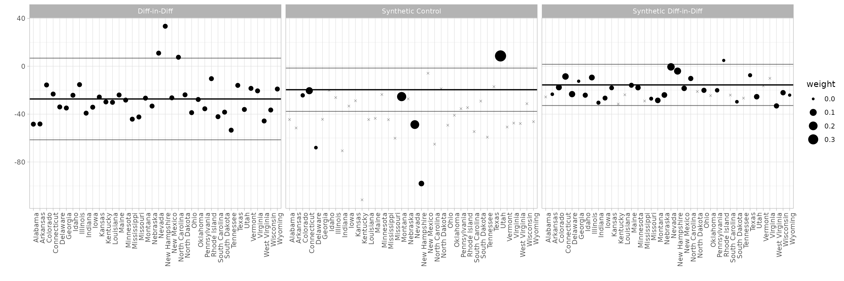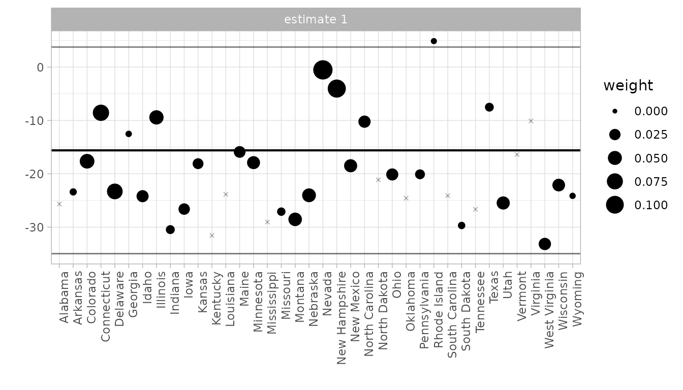 We could draw the plot above, and get a questionable treatment effect estimate, by comparison to any individual control state. Our actual estimate is a weighted average of these: the weights are the synthetic control weights . This plot shows each individual comparison with a dot, with weight determining the dot size. The black horizontal line shows the actual effect; the gray ones show the endpoints of a 95% confidence interval.
