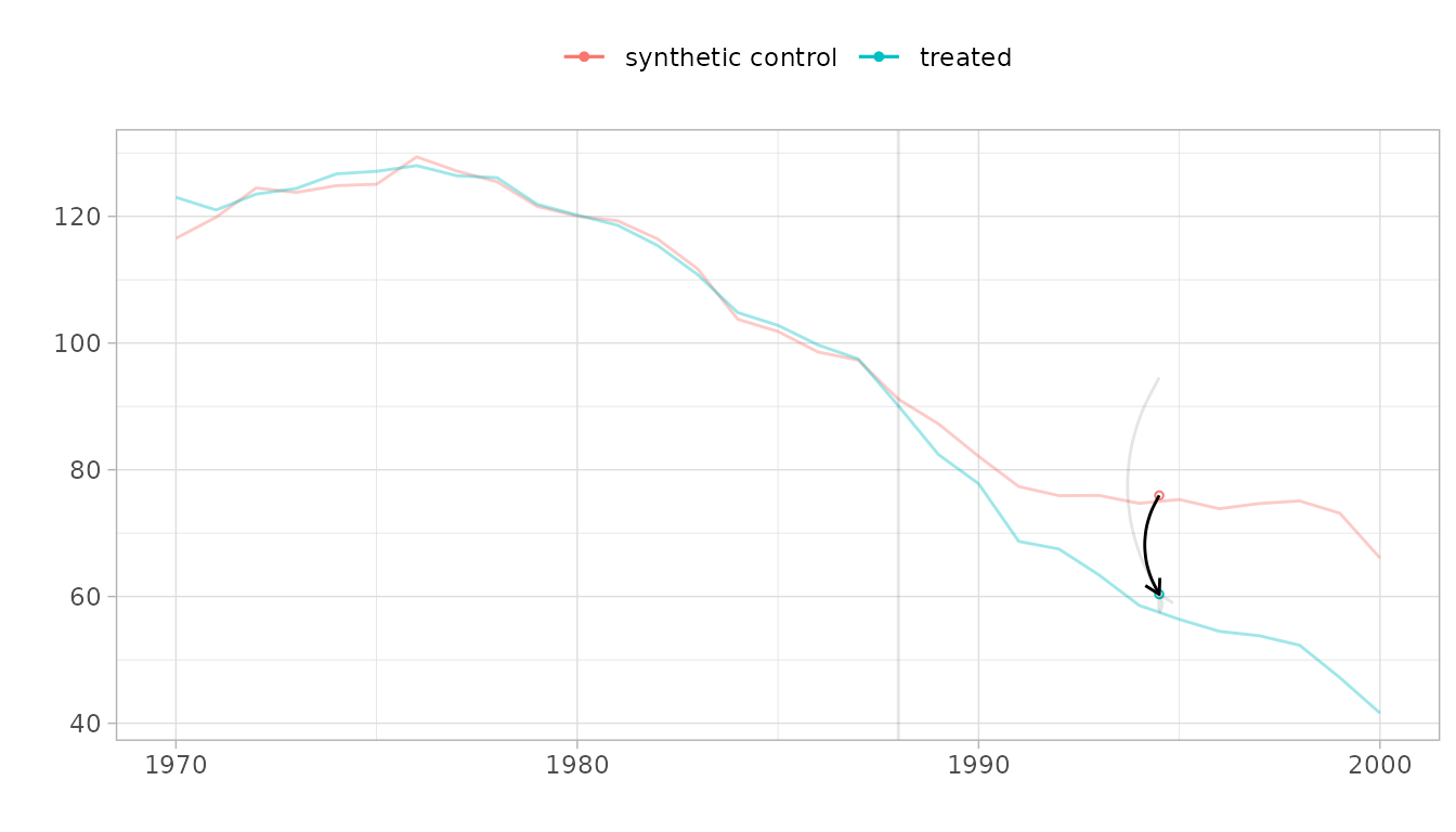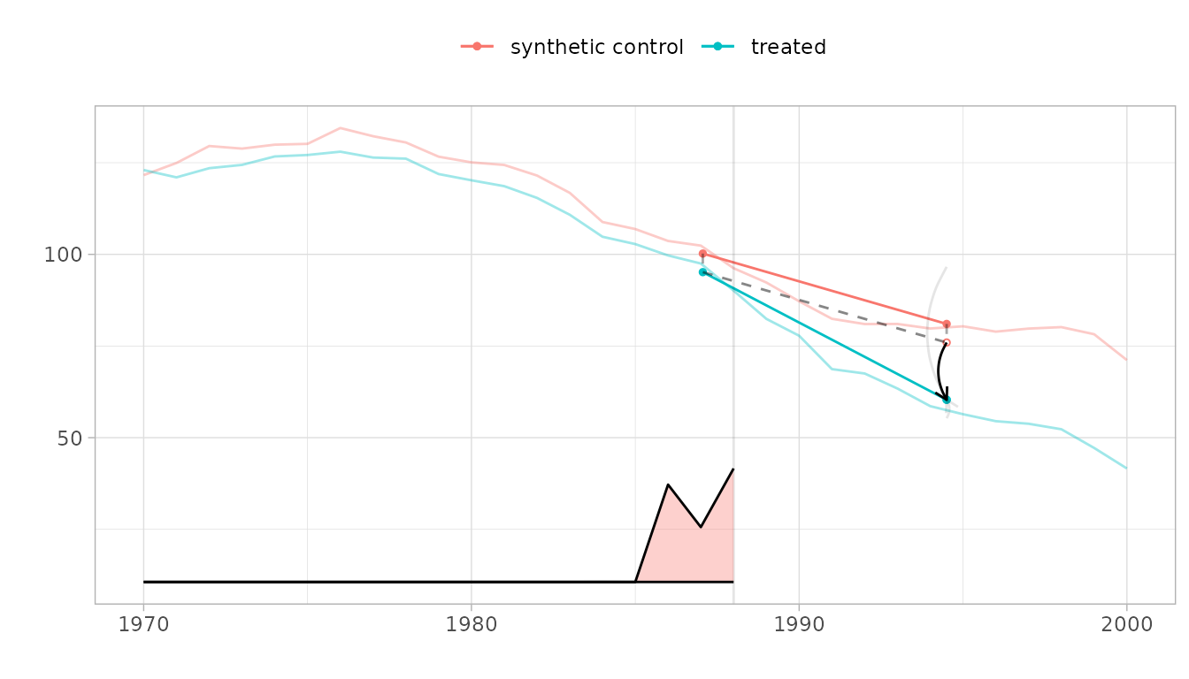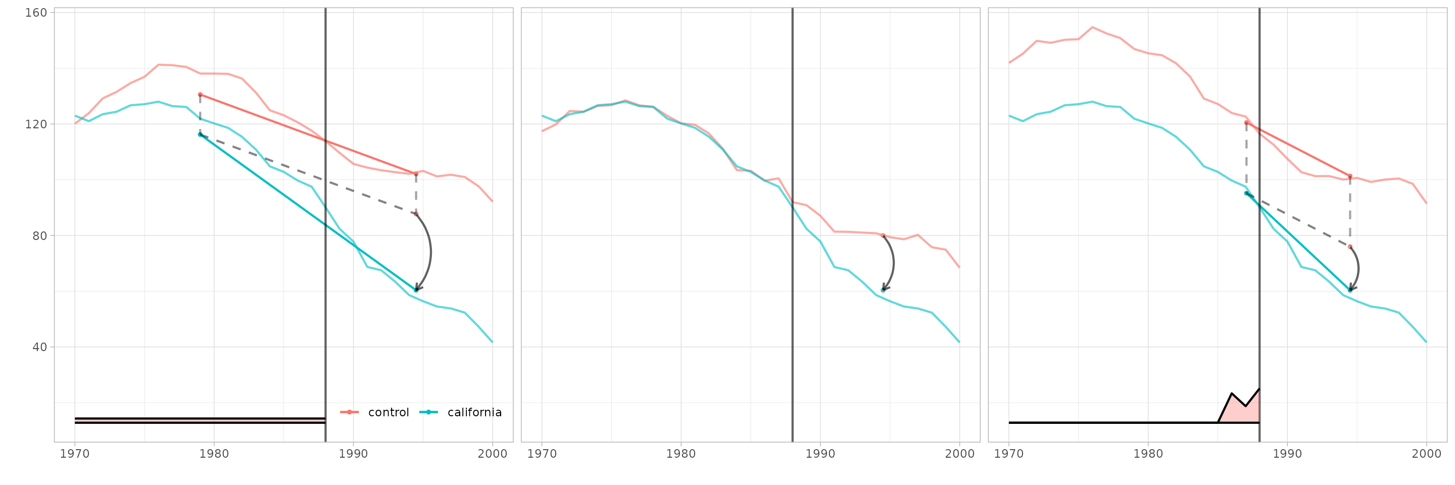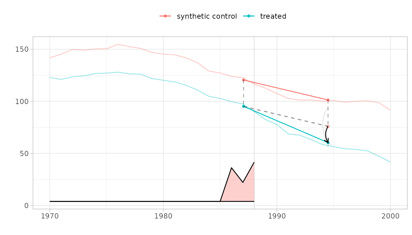 Our premise is that, absent treatment, California would change like the synthetic control: from California’s pre-treatment average, we draw a dashed segment parallel to the control’s red one. Where it ends is our estimate of what we’d have observed in California had, contrary to fact, it not been treated.