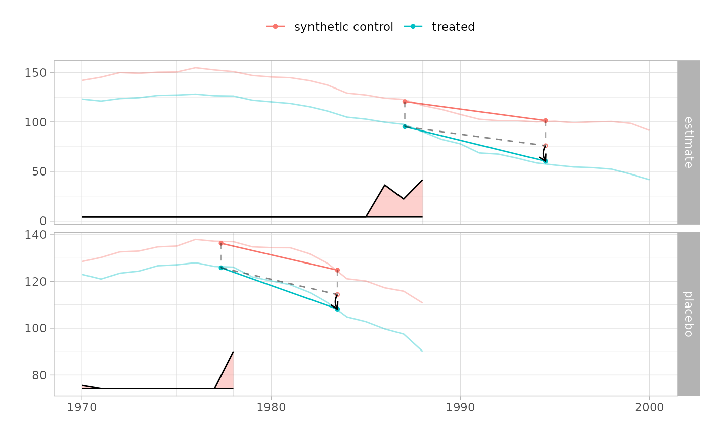For our estimator and a placebo, plots treated and synthetic control trajectories and overlays a 2x2 diff-in-diff diagram. Requires ggplot2