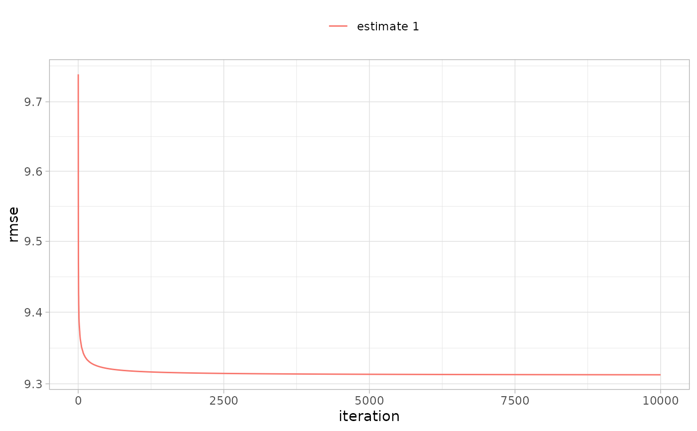 synthdid_rmse_plot.RdA diagnostic plot for sc.weight.fw.covariates. Plots the objective function, regularized RMSE, as a function of the number of Frank-Wolfe / Gradient steps taken. Requires ggplot2