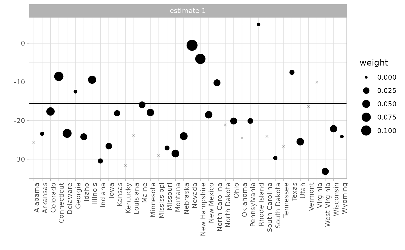 synthdid_units_plot.RdPlots unit by unit difference-in-differences. Dot size indicates the weights omega_i used in the average that yields our treatment effect estimate. This estimate and endpoints of a 95% CI are plotted as horizontal lines. Requires ggplot2